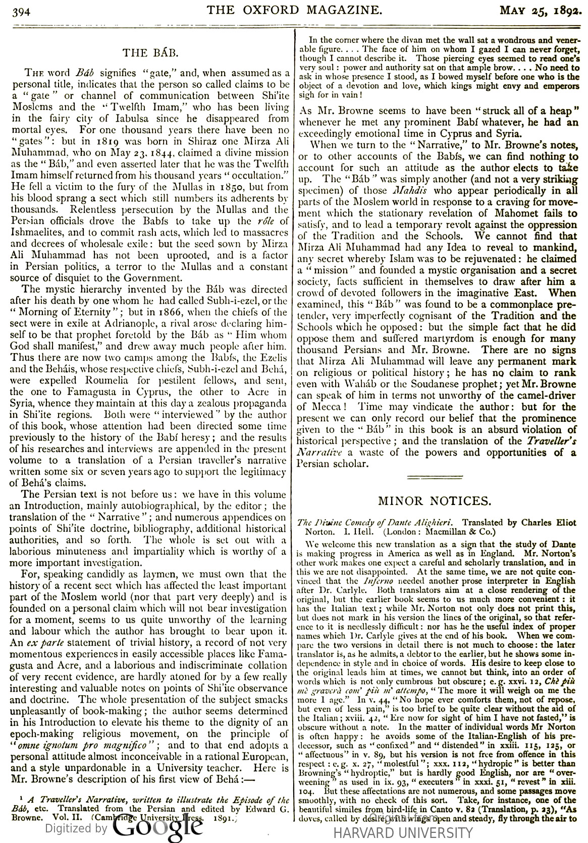 Background: 1. Image (see text below)![]() click for larger 1. OCR textThe word Báb signifies "gate," and, when assumed as a personal title, indicates that the person so called claims to be a "gale" or channel of communication between Shite Moslems and the "Twelfth Imam," who has been living in the fairy city of Iabulsa since he disappeared from mortal eyes. For one thousand years there have been no : but in 18rg was born in Shiraz one Mirza Ali Muhammad, who on May 23. 1844, claimed a divine mission as the " Báb" and even asserted later that he was the Twelfth Imam himself returned from his thousand years " occultation." He fell a victim to the fury of the Mullas in 1850, but from his blood sprang a sect which still numbers its adherents by Relentless persecution by the Mullas and the Persian officials drove the Babis 1o take up the róle of Ishmaelites, and to commit rash acts, which led to massacres and decrees of wholesale exile: but the seed sown by Mirza Ali Muhammad has not been uprooted, and is a factor in Persian politics, a terror to the Mullas and a constant source of disquiet to the Government.The mystic hierarchy invented by the Báb was directed after his death by one whom he had called Subh-i-ezel, or the "Morning of Eternity"; but in 1866, when the chiefs of the sect were in exile at Adrianople, a rival arose declaring himself to be that prophet foretold by the Báb as " Him whom God shall manifest," and drew away much people after him. Thus there are now two camps among the Babis, the Ezelis and the Beháis, whose respective chiefs, Subh-i-ezel and Behá, were expelled Roumelia for pestilent fellows, and sent, the one to Famagusta in Cyprus, the other to Acre Syria, whence they maintain at this day a zealous propaganda in Shiite regions. Both were "interviewed" by the author of this book, whose attention had been directed some time previously to the history of the Babi heresy; and the results of his researches and interviews are appended in the present volume to a translation of a Persian traveller's narrative written some six or seven years ago to support the legitimacy of Behá's claims. The Persian text is not before us: we have in this volume an Introduction, mainly autobiographical, by the editor; the translation of the " Narrative" ; and numerous appendices on points of Shi'ite doctrine, bibliography, additional historical authorities, and so forth. The whole is set out with a laborious minuteness and impartiality which is worthy of a more important investigation. For, speaking candidly as laymen, we must own that the history of a recent sect which has affected the least important part of the Moslem world (nor that part very deeply) and is founded on a personal claim which will not bear investigation for a moment, seems to us quite unworthy of the learning and labour which the author has brought to bear upon it. An ex parle statement of trivial history, a record of not very momentous experiences in easily accessible places like Fama-gusta and Acre, and a laborious and indiscriminate collation of very recent evidence, are hardly atoned for by a few really interesting and valuable notes on points of Shiite observance and doctrine. The whole presentation of the subject smacks unpleasantly of book-making; the author seems determined in his Introduction to elevate his theme to the dignity of an epoch-making religious movement, on the principle of "omne ignotum pro magnifico"; and to that end adopts a personal attitude almost inconceivable in a rational European, and a style unpardonable in a University teacher. Here is Mr. Browne's description of his first view of Behá:—